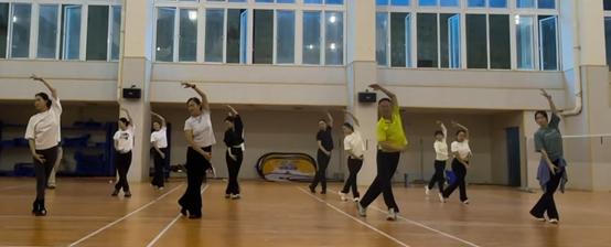 随后,老师们在杨英和杨军老师的组织下学习新编创的形体舞蹈。该形体舞蹈课程由成都教学部率先创编,经公共体育部结合雅安校区实际再次编创,创新性地以校歌《相聚在桂花飘香的时节》为基础、将学校文化特色融入体育教学,将作为大一女生公体课的教学内容。这一创意实现了美育与体育的完美结合。每个舞蹈动作由冯素琼、杨柳洁老师精心设计,确保舞姿流畅与曼妙;杨英、杨军、赵亚茹、王燕和余明荣老师基于所在校区公共体育课学时数量和学情对部分舞蹈动作进行优化,最终形成美观,易学的成套舞蹈作品。