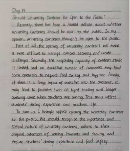 活动期间,同学们展现出高度的自觉性与学习热情。不少学生根据自身薄弱环节制定个性化计划,或研读范文以梳理行文逻辑,或通过仿写积累实用表达;部分学生更是自发组建学习小组,在线交流写作心得、互评互改,形成了“比、学、赶、超”的积极氛围。活动后期,同学们按要求将完整写作稿件整理并拍照,通过指定平台统一提交,确保每份练习成果得到有效记录与反馈。
