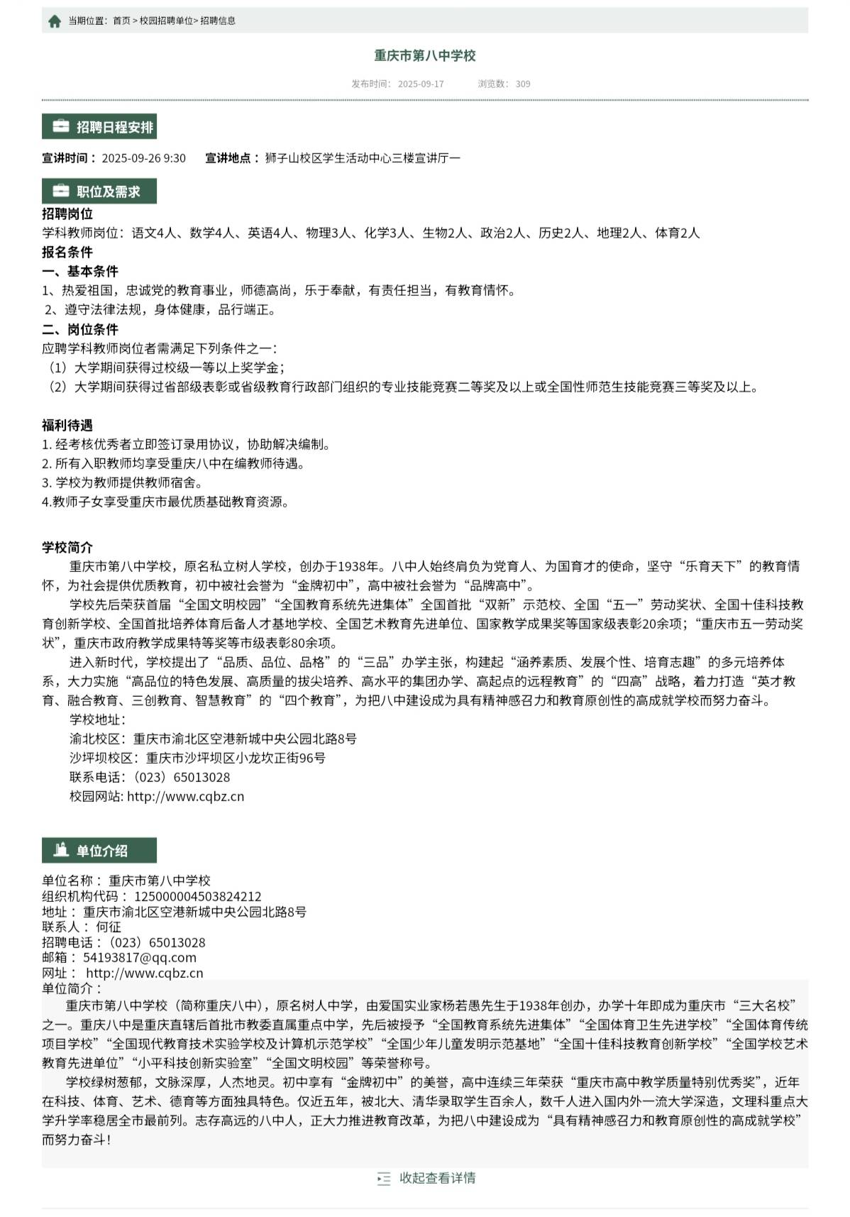【就业信息202512】重庆市第八中学校