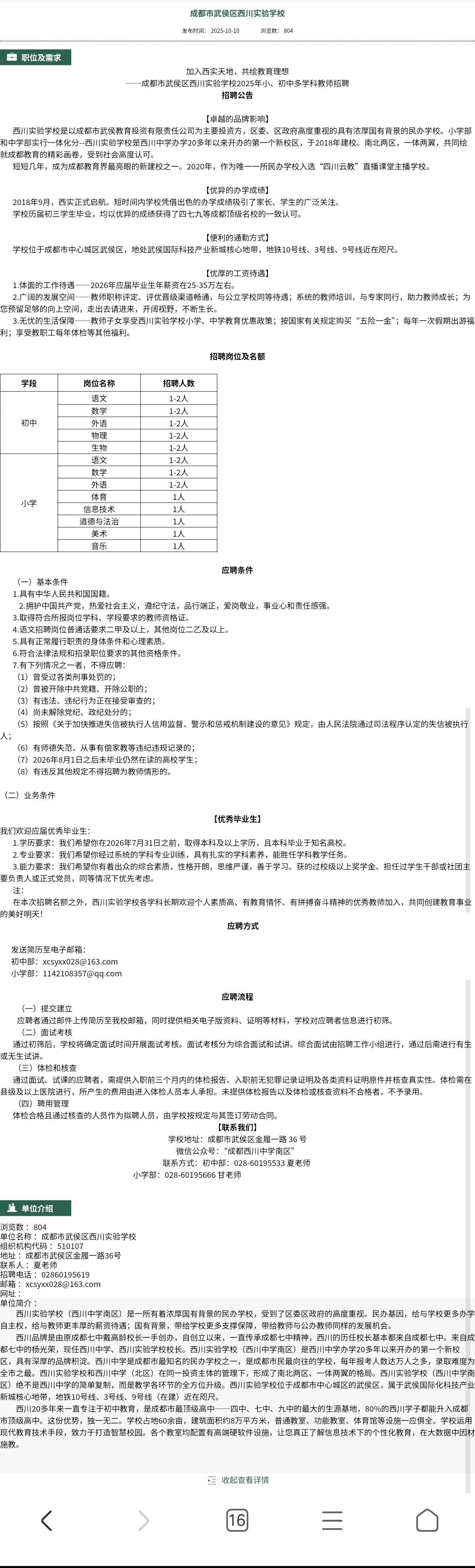 【就业信息202515】成都市武侯区西川实验中学