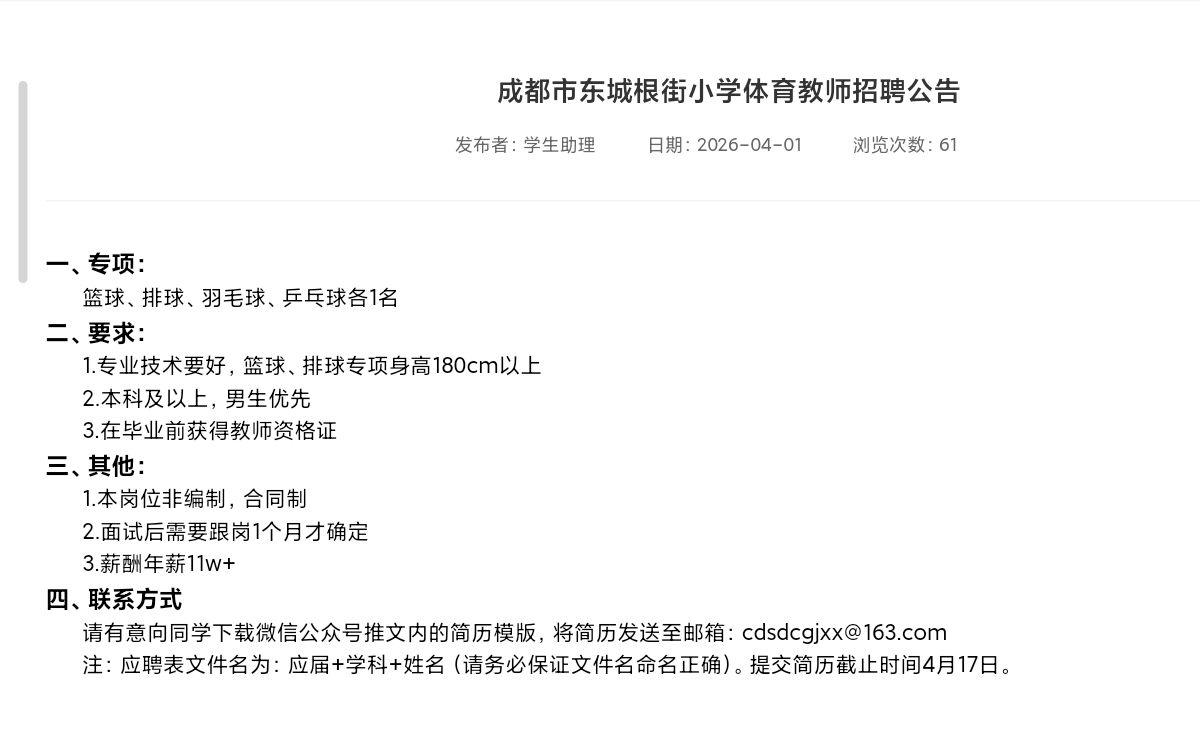【就业信息202639】成都市东城根街小学体育教师招聘