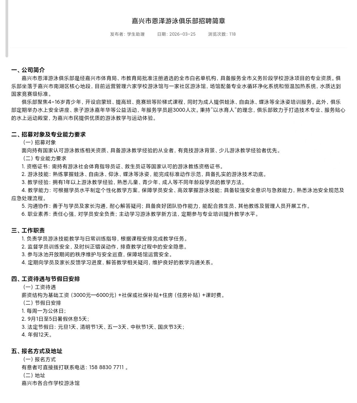 【就业信息202640】嘉兴市恩泽游泳俱乐部招聘