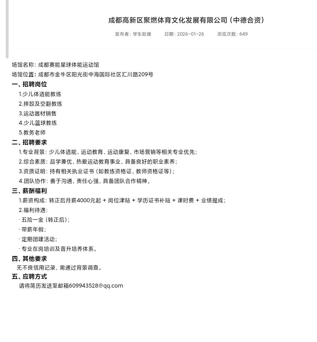 【就业信息202641】成都高新区聚燃体育文化发展有限公司(中德合资)