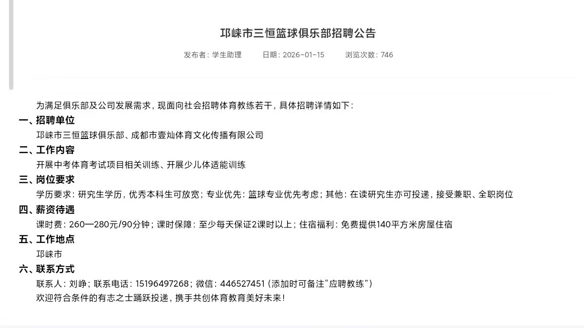 【就业信息202642】邛崃市三恒篮球俱乐部招聘公告