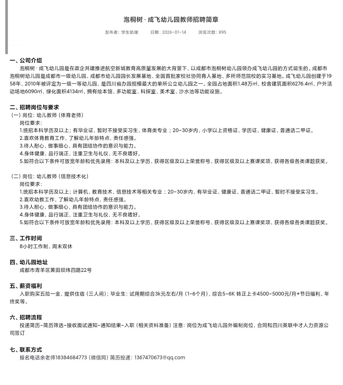 【就业信息202644】泡桐树·成飞幼儿园教师招聘