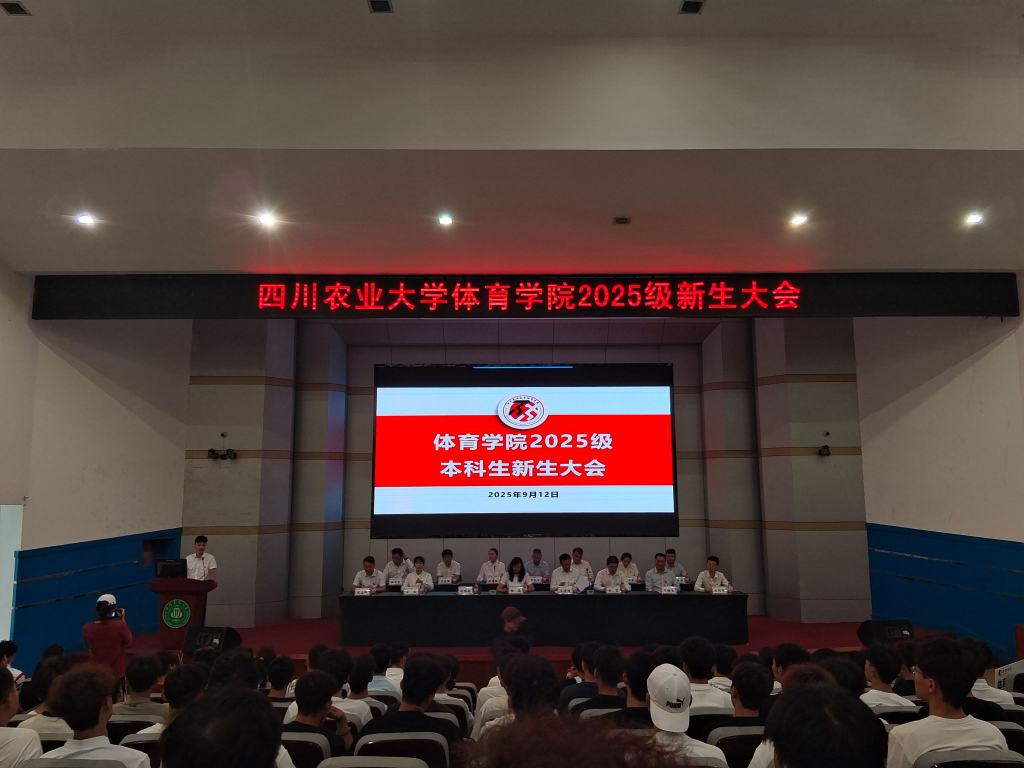 9月12日下午,四川农业大学体育学院2025级本科生新生大会在逸夫楼小礼堂举行。全体院领导、各系室主任、新生班主任、全体辅导员和全体2025级新生共同参会,会议由学院党委副书记陈明滟主持。