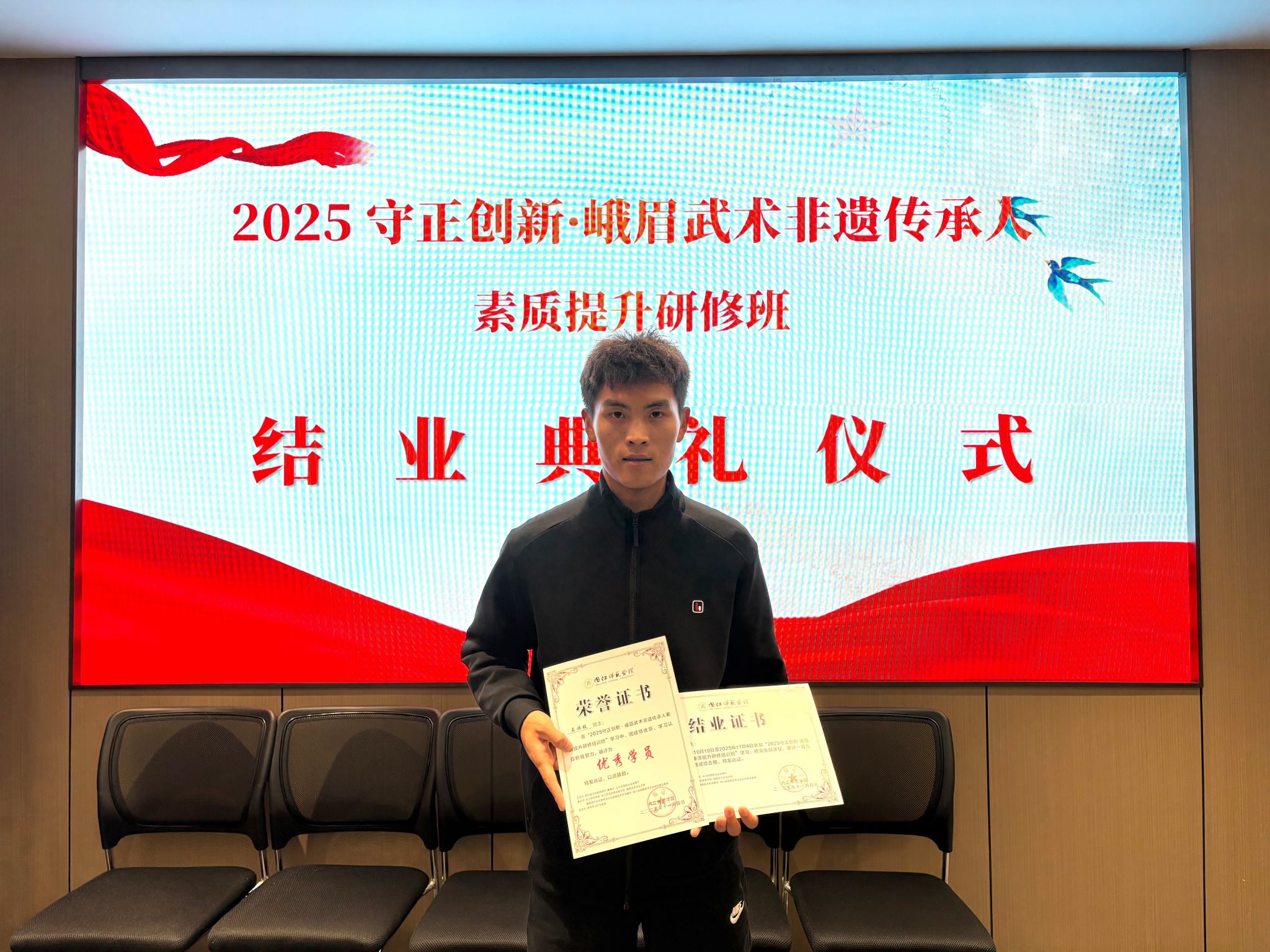 10月10日—11月4日,由四川省文化和旅游厅、教育厅、人力资源和社会保障厅联合主办,内江师范学院、教育部中华优秀传统文化峨眉武术传承基地承办,各地市(州)协办的“2025守正创新·峨眉武术非遗传承人素质提升研修班”圆满结业。我院2024级研究生王淋枝经学院推荐参加培训,顺利完成全部学习任务,获技术考核95分(班级并列第一),并获评“优秀学员”。