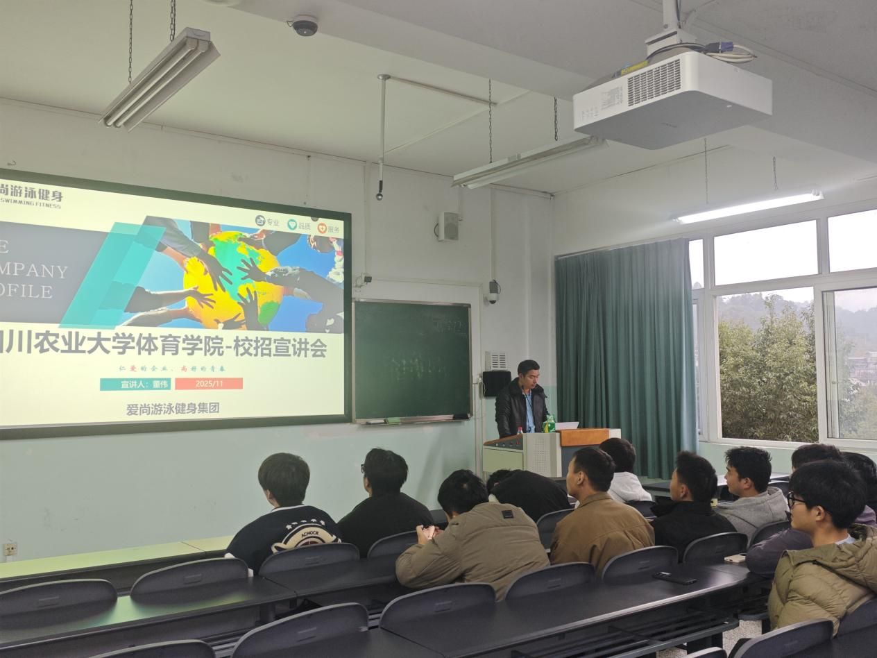 当日宣讲会上,爱尚游泳健身集团宣讲人董伟以“仁爱的企业、尚好的青春”为主题,结合健身行业发展趋势与企业岗位需求,向在场学子详细介绍了集团的人才培养体系、晋升路径及招聘岗位,涵盖健身教练、运营管理等多个方向,为不同职业规划的学子提供选择。