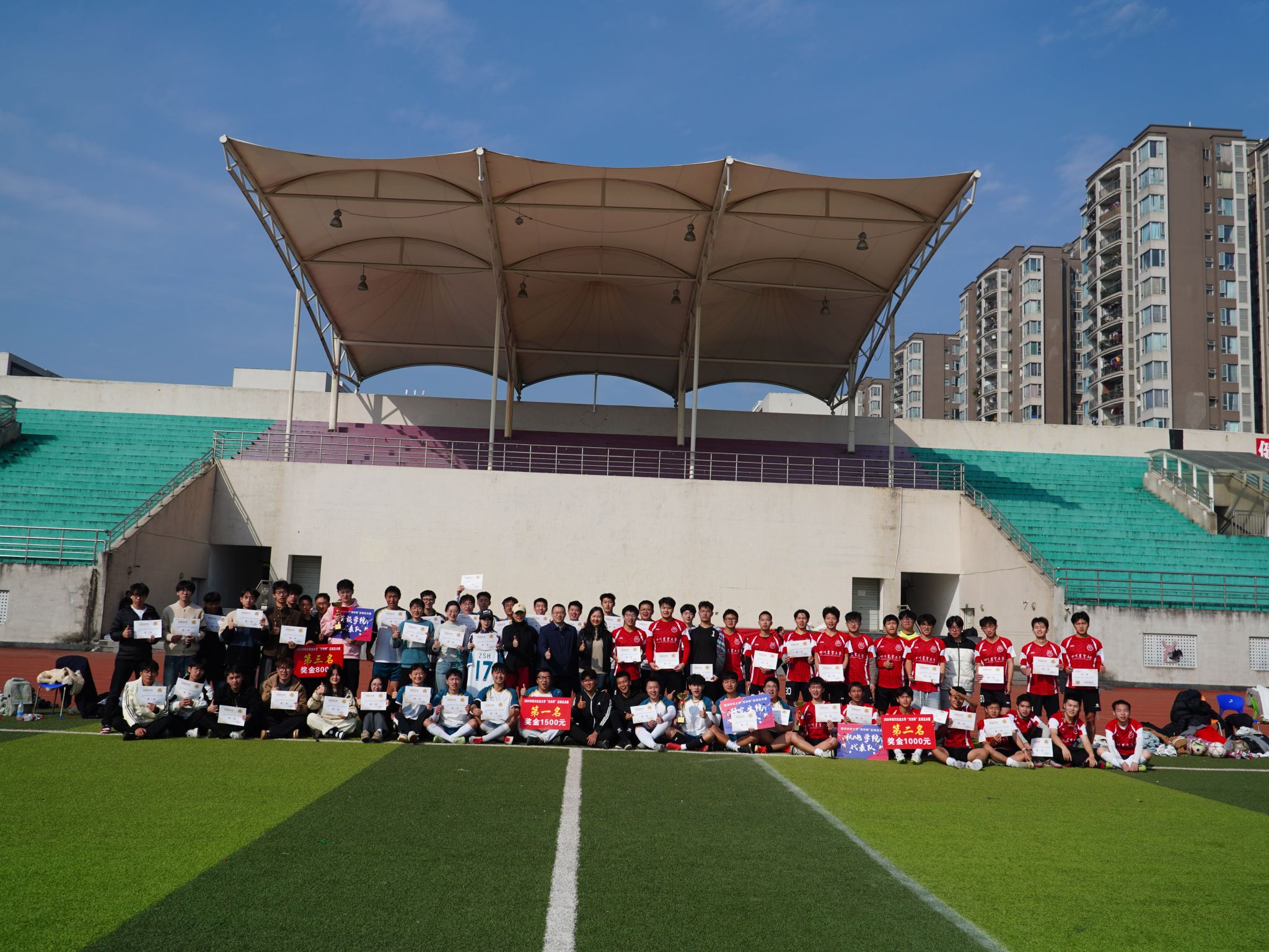 成都校区承担足球总决赛赛事,绿茵场上,队员们秉持“协作、拼搏、公平、尊重”的体育精神,全力奔跑、积极拼抢,传球、射门动作行云流水。经过多轮激烈角逐,研究生院队凭借稳定发挥摘得桂冠,机电学院队获亚军,商旅学院队获季军。