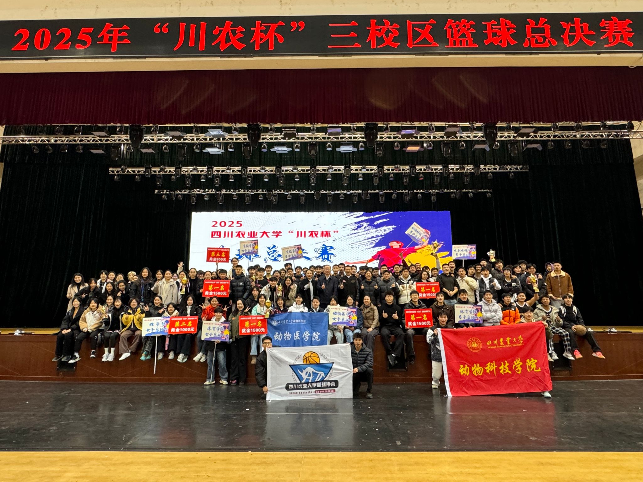 雅安校区作为篮球总决赛主场,现场欢呼声、呐喊声此起彼伏。赛场上,各队伍攻防节奏明快,抢断、传球、上篮、三分球轮番上演,每一个精彩瞬间都点燃全场激情。经过激烈比拼,动物科技学院男篮与体育学院男篮共同拿下男子组第一名;动物医学院女篮与体育学院女篮实力相当、战至平手,并列女子组第一名。
