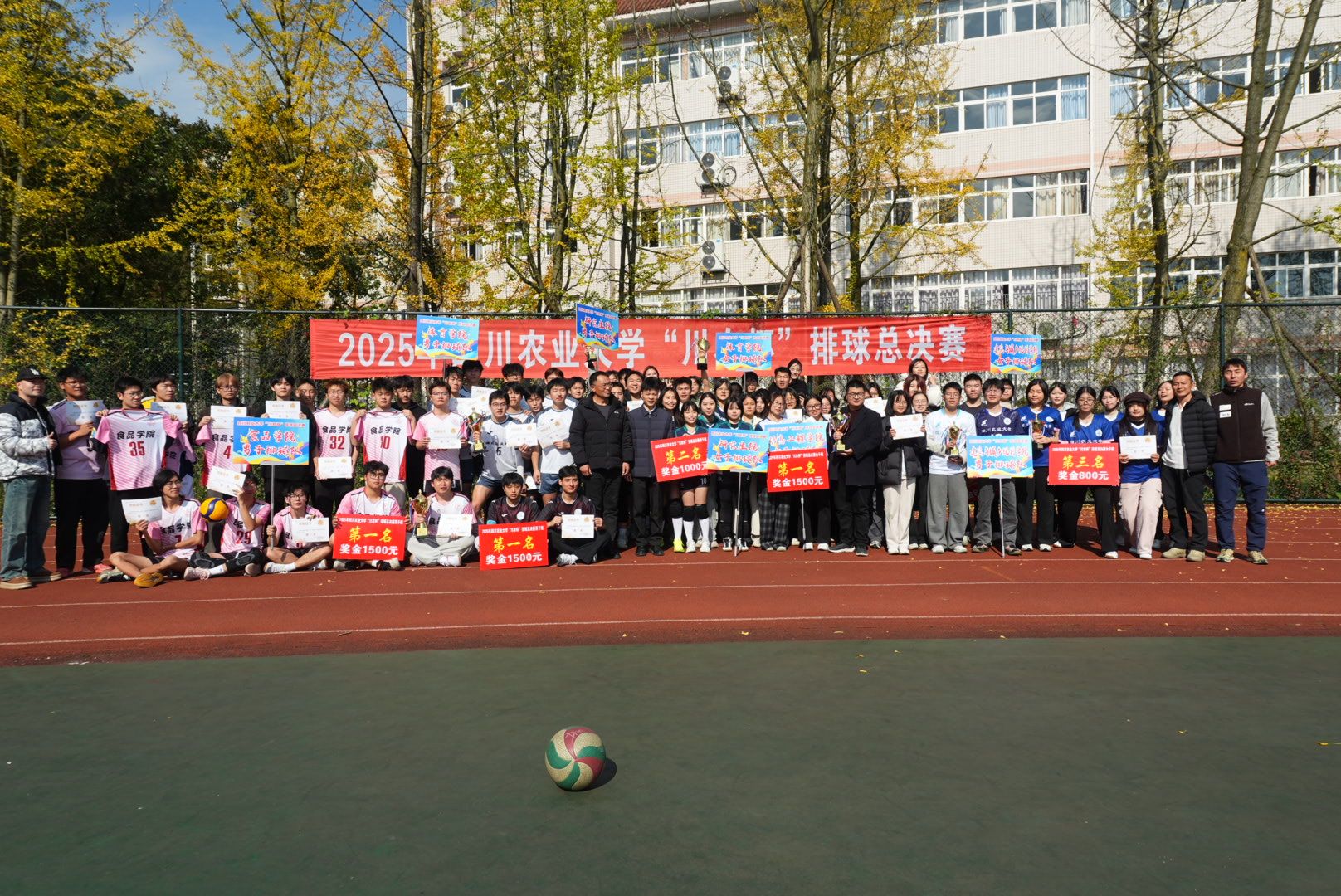 都江堰校区聚焦排球总决赛,在金黄色的银杏树下,在阳光灿烂的操场上,各参赛队伍尽显协作魅力。队员们在赛场上精准传球、奋力扣杀、严密拦网,用汗水诠释对运动的热爱。比赛结束后,各参赛队还一致同意组建了三校区临时联队和体育学院男排队伍开展了一场更加精彩的对决式表演赛,现场师生频频发出惊叹,将排球赛推向了高潮。最终,食品学院男排与体育学院男排共同斩获了男子组第一名;信息工程学院女排拿下女子组第一名。