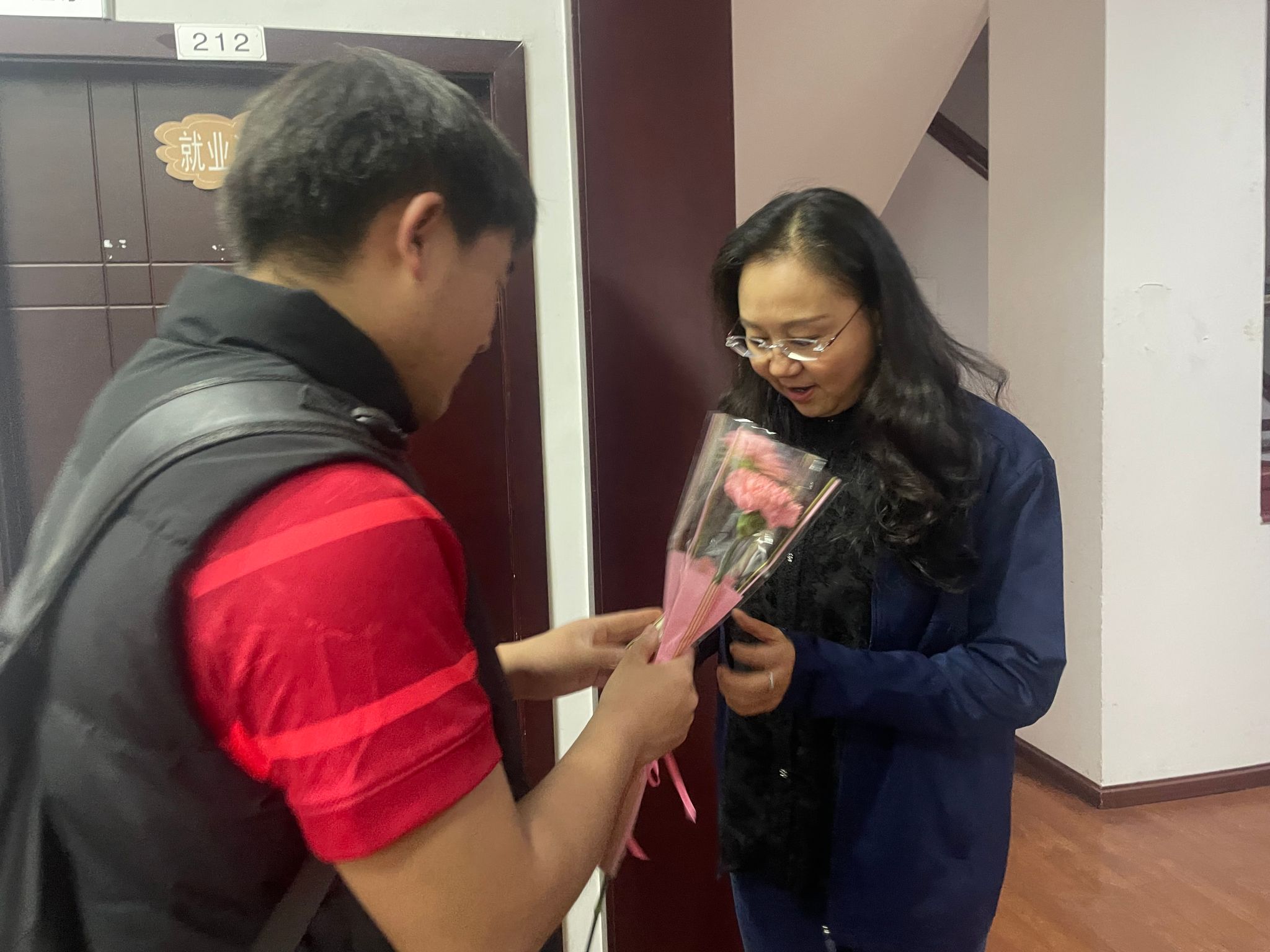 院学生会学生代表手捧鲜花与贺卡,利用课间休息时间,轻轻叩响一间间办公室的门。当这份满载心意的礼物送到老师们手中时,老师们的脸上绽放出惊喜而幸福的笑容。“谢谢孩子们,收到这份心意太开心啦!”杨英书记动情地说。一朵朵绽放的康乃馨,映衬着老师们欣慰的脸庞;一张张写满祝福的贺卡,承载着学子们浓浓的敬意。这份纯粹而温暖的心意,是对她们躬耕教坛、默默奉献的最好回报。