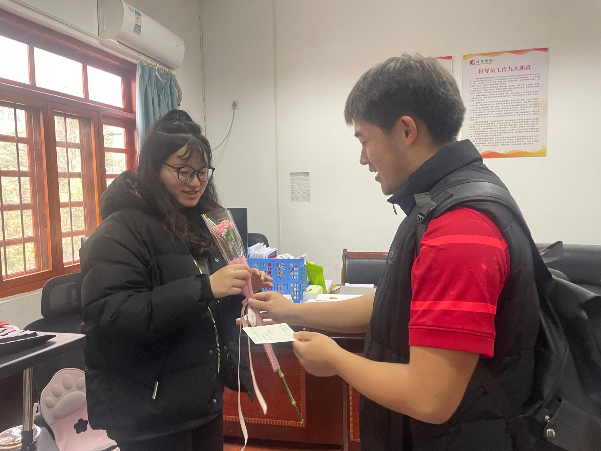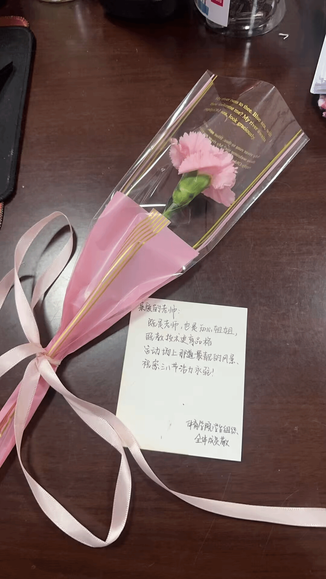 节日前夕,院学生会的同学们便悄悄开始了准备工作。他们精心挑选了娇艳的康乃馨——这种寓意着爱与尊敬的花朵,最能代表体院学子对老师们的感恩之心。而更显用心的,是那一张张由同学们亲手书写的祝福贺卡。课余时间,同学们围坐在一起,一笔一划地写下对老师的心里话:“三尺讲台育桃李,谆谆教诲润心田。老师,您辛苦了!”“既是老师,也是知心姐姐.......祝您节日快乐!”字里行间,流淌着体育人特有的质朴与真挚。