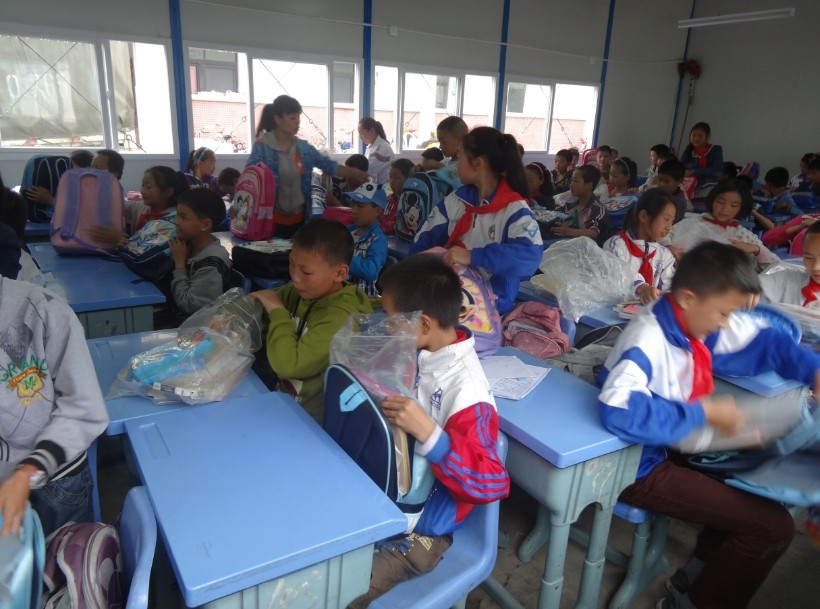 陇西中心校的老师们带着孩子们积极有序地搬运包裹、领取书包,并由志愿者们亲自把书包送到孩子们手中,孩子们接过书包,每个人脸上都洋溢着幸福的笑容,爱惜、仔细地整理图书。学校老师向志愿者表达了真挚的感谢。