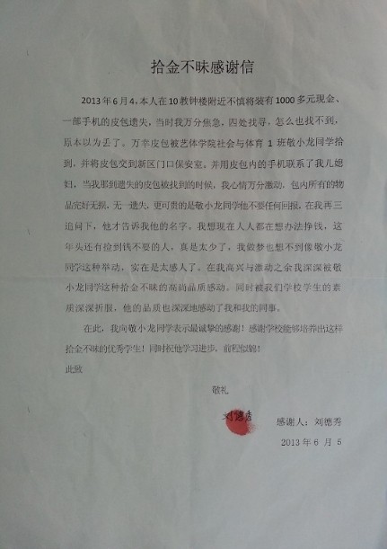 据悉,事后失主多次表示要给予回报,但均被婉言谢绝,在失主多次追问下他才道出班级姓名。失主刘德秀在感谢信中写到,在“这年头”,她及同事都被敬小龙同学的高尚品质深深感动和折服,对学校培养出这样拾金不昧的优秀学生表示感谢。